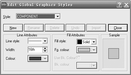 执行菜单命令“Template”→“Set Graphics Styles…,弹出如图2-18所示对话框,进行图形格式的设置。在此对话框的“Style”下拉列表框中可选择不同的系统图形风格,可设置线型(Line style)、线宽(Width)、线的颜色(Colour);设置图形填充方式(Fill style)、填充颜色(Fg.colour)。