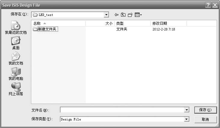 图标,或执行菜单命令“File”→“Save Design…,弹出如图2-32所示的对话框。在此对话框中选择保存路径为G盘“程序与仿真”目录,保存文件名为LED test。该文件的扩展名为.DSN,即该文件名为LED test.DSN。文件保存后在ISIS 7 Professional窗口的标题栏上显示为LED test。