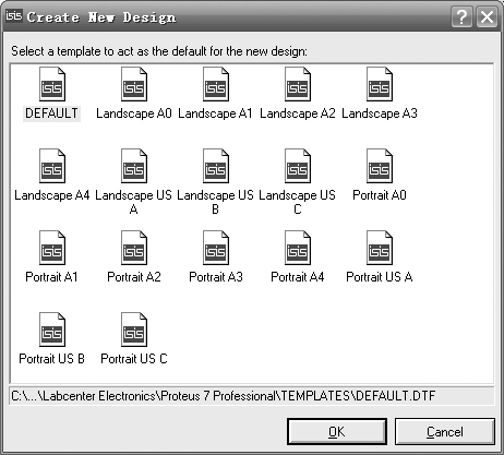 ,打开ISIS 7 Professional窗口。单击菜单“File”→“New Design”,弹出如图2-31所示的图纸模板选择窗口。横向图纸为Landscape,纵向图纸为Portrait,DEFAULT为默认模板。选中DEFAULT,单击“OK”按钮,则新建一个DEFAULT模板。也可以在ISIS 7 Professional窗口中直接单击