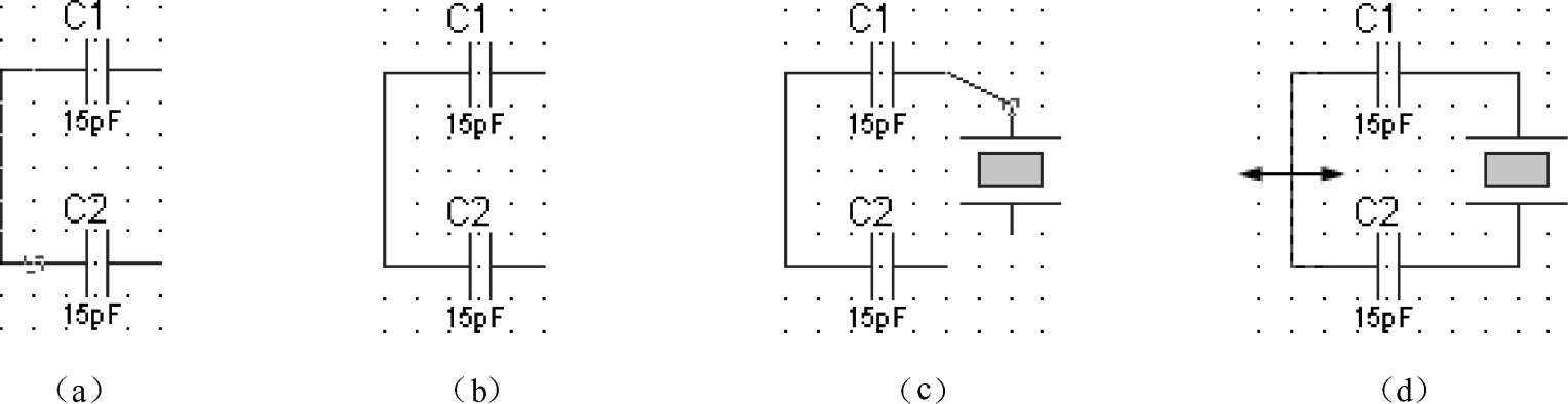 ”时再单击鼠标即可画一条连线,如图2-36(a)所示;若想手动设定走线路径时,拖动鼠标过程中在想要拐点处单击,设定走线路径,到达画线端的另一端单击鼠标左键,即可画好一条连线,如图2-36(b)所示;在拖动鼠标过程中按住Ctrl键,当画线的另一端出现一个“