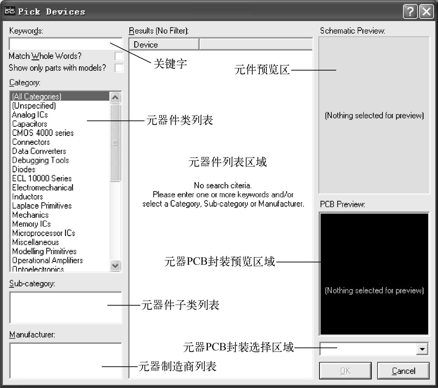 时,才会有器件选择按钮。器件选择按钮中的“P”为对象选择按钮,“L”为库管理按钮。当按下“P”时弹出如图2-15所示对话框,在“Keywords”栏中输入器件名,单击“OK”按钮就可从库中选择元器件,并将所选器件名一一列在“对象选择器”窗口中。