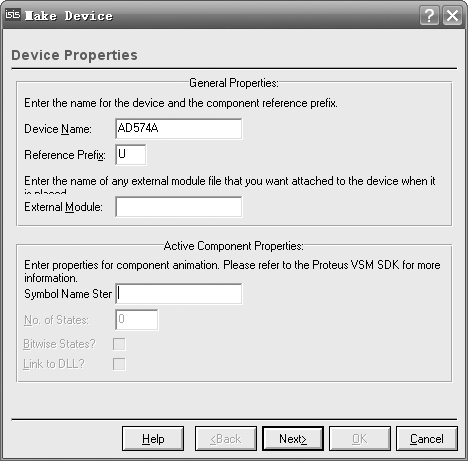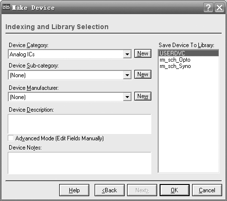 按钮,弹出如图2-52所示对话框,在“Device Name”栏中输入元件名称AD574A,在“Reference Prefix”栏中输入“U”,单击“Next”按钮,弹出如图2-53所示对话框,在此对话框中单击“Add/Edit”按钮,弹出另一对话框,再单击“Add”按钮,在Pick Packages对话框的“KeyWords”关键词栏中输入“DIL28”,单击“OK”按钮,然后单击“Assign Package”按钮,返回图2-52所示对话框中。封装选择好后,直接单击三次“Next”按钮,弹出如图2-54所示对话框。在“Device Category”栏中可创建用户自己的库或选择相应元件库本例中选择,“Analog ICs”。