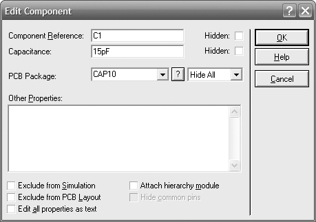 7)设置、修改元件属性 在需要修改的元件上右击鼠标,在弹出的菜单中选择“Edit Properties”,或按快捷键Ctrl+E,出现“Edit Component”对话框,在此对话框中设置相关信息,如修改电容为“15pF”,如图2-41所示。