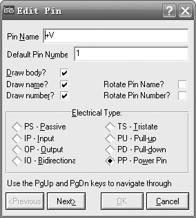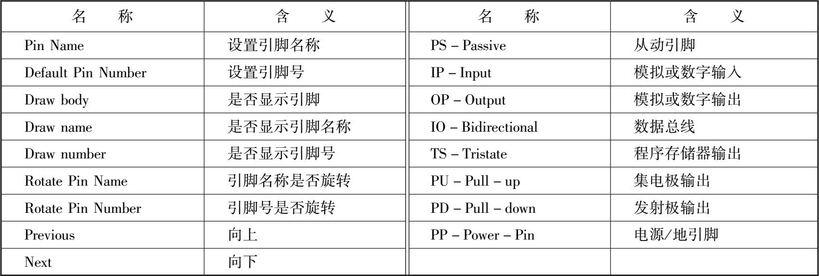 3)编辑引脚 在需要定义的器件引脚上双击鼠标左键,弹出如图2-50所示对话框。对话框中各项设置的含义如表2-3所示。如果引脚名为带上画线的字符或字符串,应在每个字符前加上$,如12/8,在Pin Name中输入“12/$8”;对于CS,在Pin Name中输入“$C$S”。在Pin Name中输入的字符区分大小写。引脚编辑结果如图2-51所示。