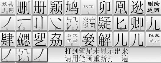 注意:当达到单字的笔尾,还未显示要输入的字时,可以用笔画重新输入一次。例如,输入“九”字时,输入“撇折”后未出现结果,可以继续输入“撇折、撇折、撇折……”,就会出现结果,如图4-5所示。