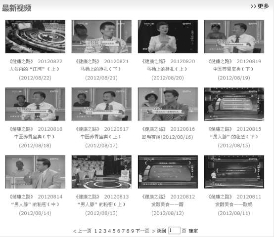 滚动鼠标滚轮,浏览页面上的内容。在“近期节目(视频)”栏目中列出了最近播放的节目,在“更多养生专题(视频建议使用Windows IE 浏览器)”栏目中列出了更多的节目,如图4-14所示。