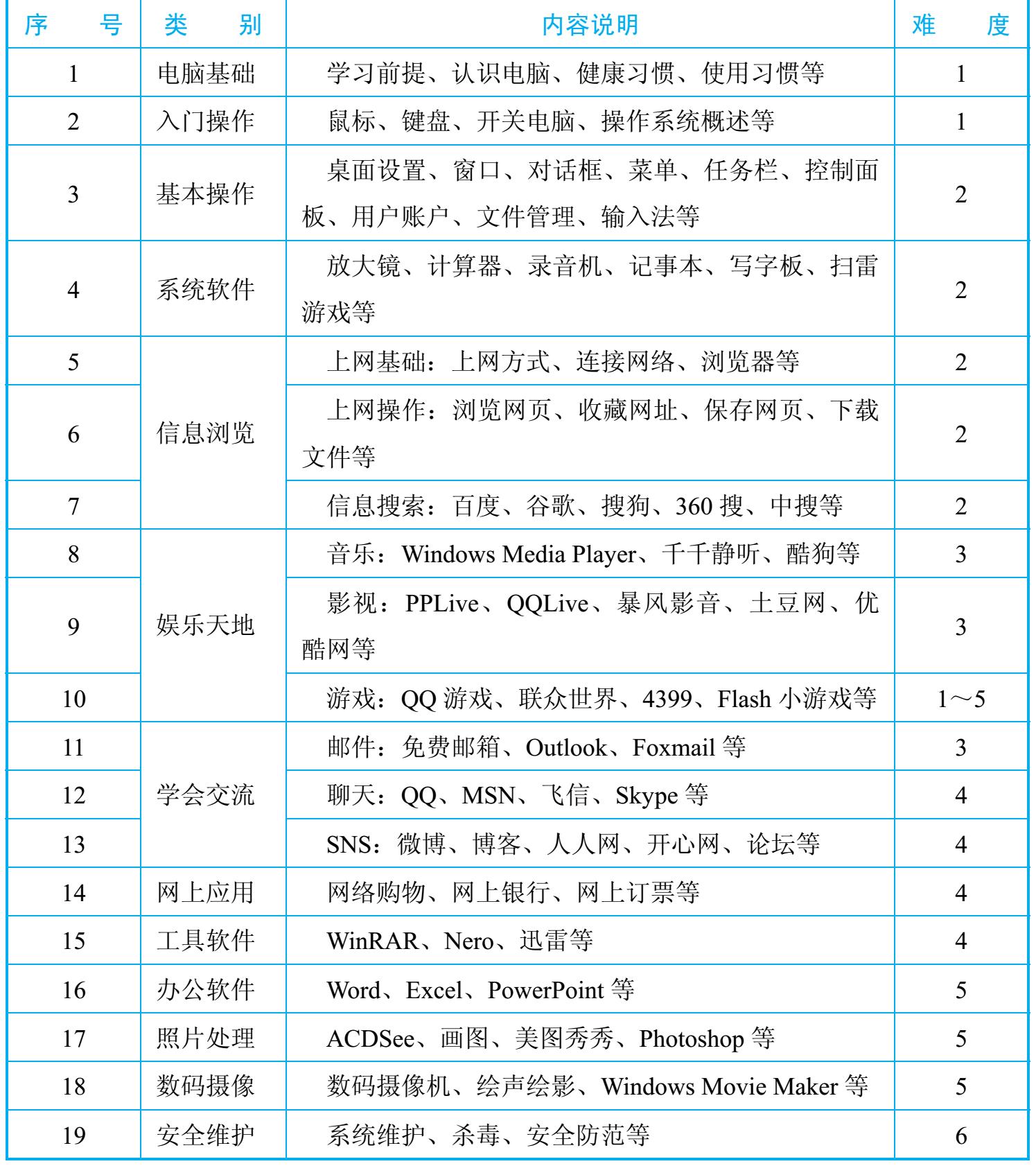 开卷有益,但需明确目标。电脑、互联网博大精深,计算机专业的博士也在学习电脑和互联网。站在长者的角度,要学习什么取决于自己的兴趣爱好和实际需求。本节按照有用性原则,分类列举了主要的学习内容和学习难度,如表1-1所示,“难度”一栏中的数字越大,表示难度越高。