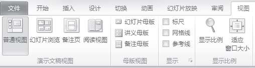 ◆切换到“视图”选项卡,在“演示文稿视图”组中单击某个按钮可切换到对应的视图模式。