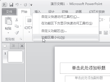 返回PowerPoint的工作界面,可看到功能选项卡区域已经被隐藏。