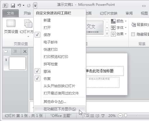 返回幻灯片工作界面,可以看到快速访问工具栏已经位于功能区下方。 uAnDQKc708Lxv4NuUJiudeNBbQ7FTn8YpWRVjkYve/LHOcbEnHGlY/+YN9NjjVF7