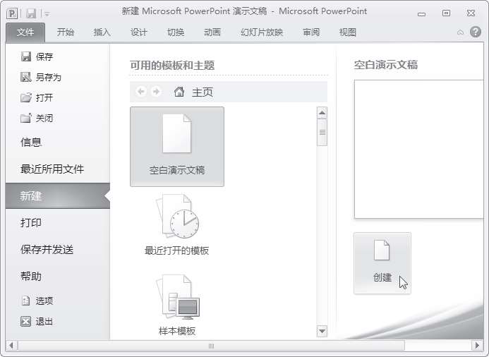◆在PowerPoint窗口中切换到“文件”选项卡,在左侧窗格选择“新建”命令,在右侧窗格的“可用的模板和主题”栏中选择“空白演示文稿”选项,然后单击“创建”按钮即可。
