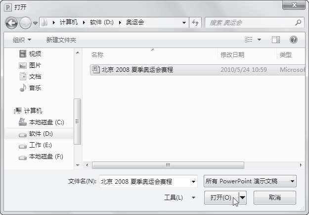 保存在电脑中的演示文稿可以随时打开进行编辑、查看或放映等操作。打开演示文稿的方法很多,包括直接双击文件打开、通过命令在PowerPoint2010工作界面中打开、通过对话框打开以及移动打开等。具体操作方法如下。