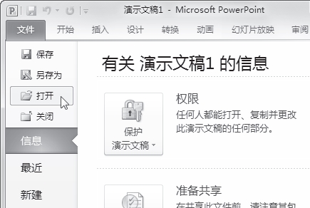 在PowerPoint窗口中切换到“文件”选项卡,在左侧窗格中单击“打开”命令。