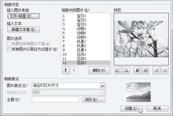 在“相册”对话框的“相册中的图片”列表框中选中某张图片后,可对其进行旋转、调整亮度、调整对比度和调整图片顺序等操作,设置好后,可通过右侧的“预览”窗格预览图片效果。