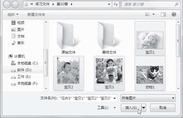 在弹出的“插图新图片”对话框中选择需要的图片(可选多张图片),单击“插入”按钮即可。