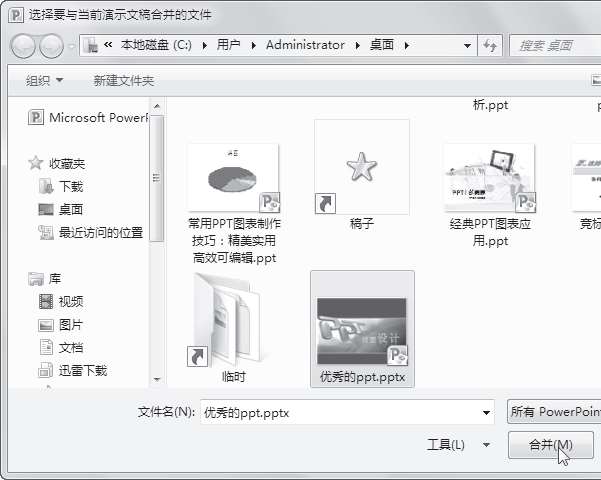 弹出对话框,选中要合并的PPT文件,单击“合并”按钮。