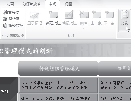 打开要合并的第1个演示文稿,切换到“审阅”选项卡,单击“批注”组中的“比较”按钮。