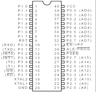 Atmel公司的AT89S系列与MCS-51系列是兼容的,这里主要以AT89S52单片机来介绍51系列单片机的基本原理。AT89S52的40Pin双列直插封装的引脚配置,如图2-3所示。
