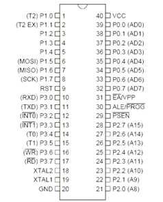 ●P1口:即P1.0~P1.7(Pin1~Pin8),输入/输出脚,8位准双向并行I/O口。P1口内部已经具有上拉电阻的8位准双向I/O口,能负载4个TTL;在Flash编程和校验时,定义为低8位地址线。和基本的8051不同的是,其部分引脚具有第二功能。引脚P1.0是定时/计数器T2的外部计数输入,引脚P1.1表示定时/计数器T2捕获/再装入触发及方向控制,引脚P1.5(MOSI)、P1.6(MISO)和P1.7(SCK)用于系统内部编程。