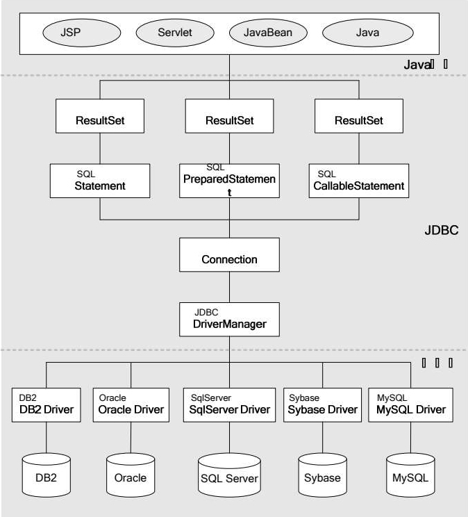 JDBC是Java数据库连接(Java Data base Connectivity)技术的缩写。JDBC为Java程序提供了一套操作各种数据库的统一接口,使得我们在使用JDBC API编写程序时无须关心所操作的各种数据库产品。