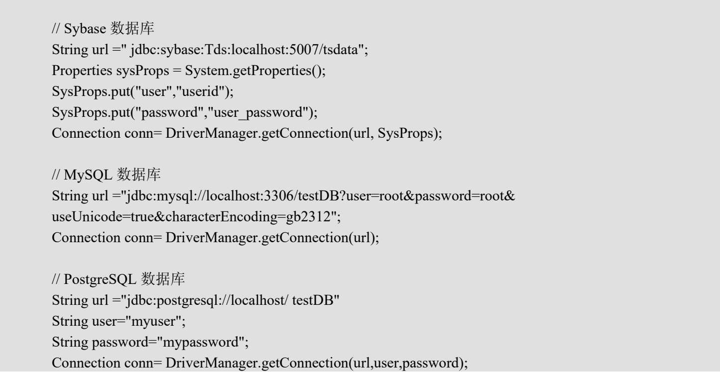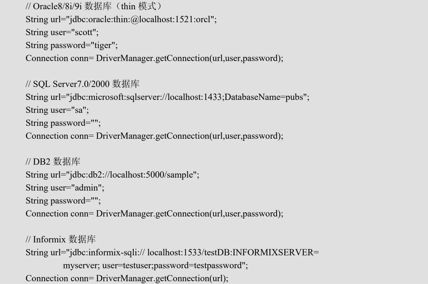 (2)加载JDBC驱动,并将其注册到DriverManager中。下面是一些主流数据库的JDBC驱动加载注册的代码: