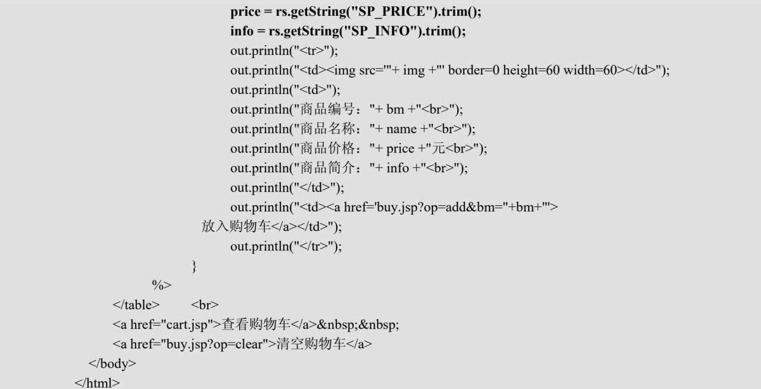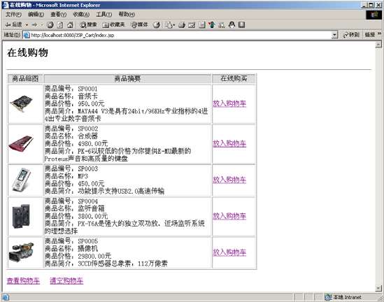 本实例通过商品浏览页面index.jsp(见例程4-1)、购物车页面cart.jsp(见例程4-2)与处理用户请求的页面buy.jsp(见例程4-3)实现一个简单的购物车系统,所有JDBC的数据库操作代码全部放置在相应的JSP页面中,这里只是为了演示JDBC在JSP中的用法而已,在实际开发中并不推荐这样使用。