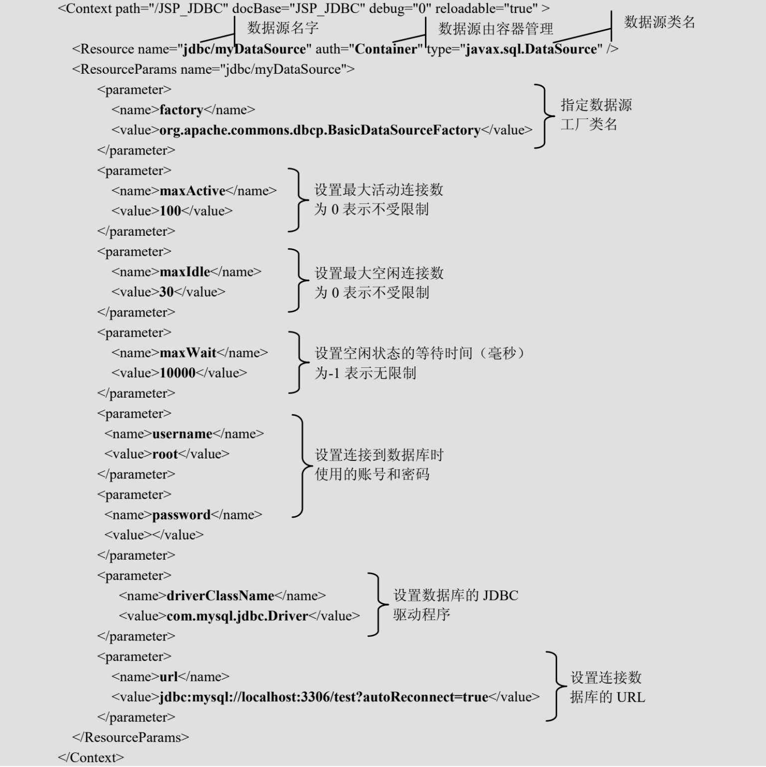 下面以Tomcat 6.0 + MySQL 5.5 为例讲解数据源和连接池的配置。