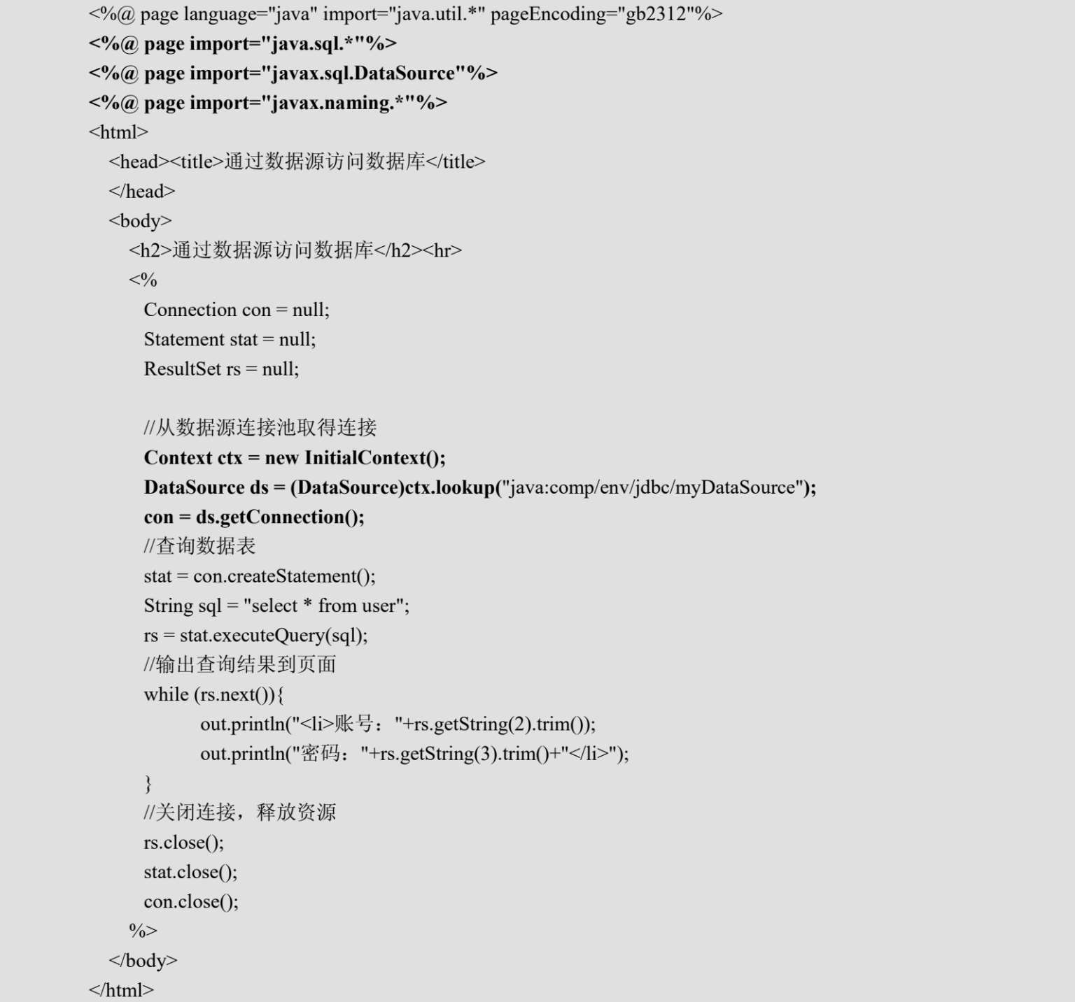 (4)在JSP或Servlet程序中通过数据源访问数据库,例如:
