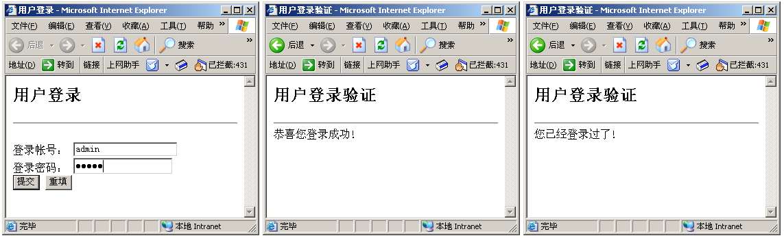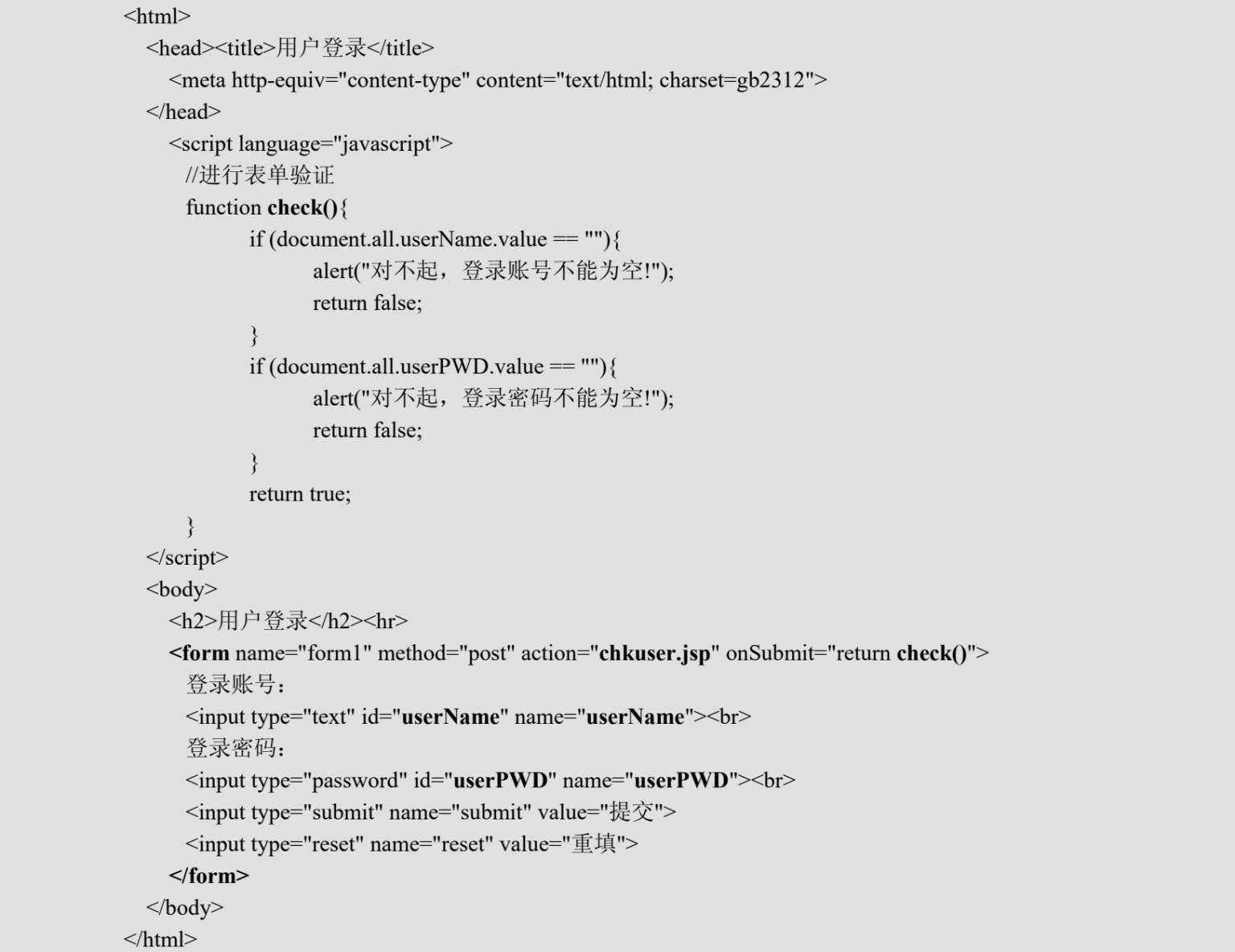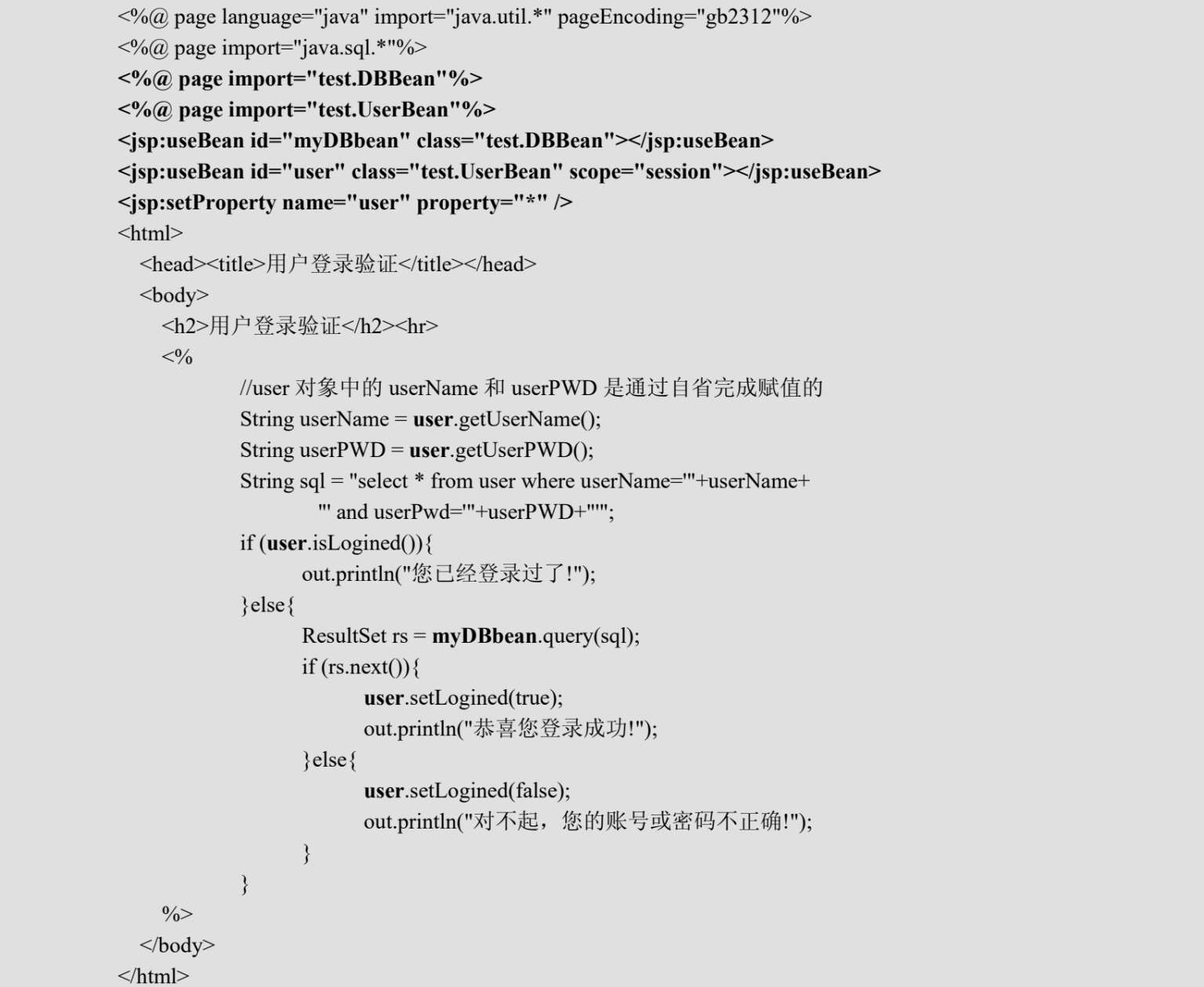 在本实例中,用户通过在登录页面login.htm(见例程4-8)中填写登录表单,然后提交给登录验证页面chkuser.jsp(见例程4-10),再由chkuser.jsp调用DBBean(见例程4-6)与UserBean(见例程4-9)完成登录的验证工作。