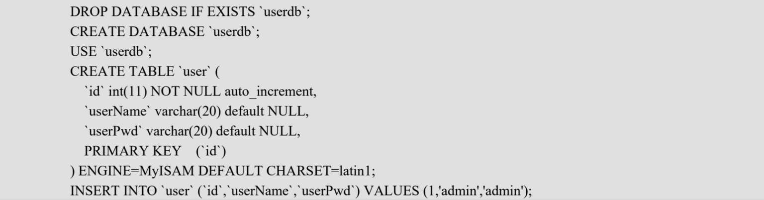 首先,在MySQL中执行脚本user.sql(见例程4-5)创建数据库userdb。