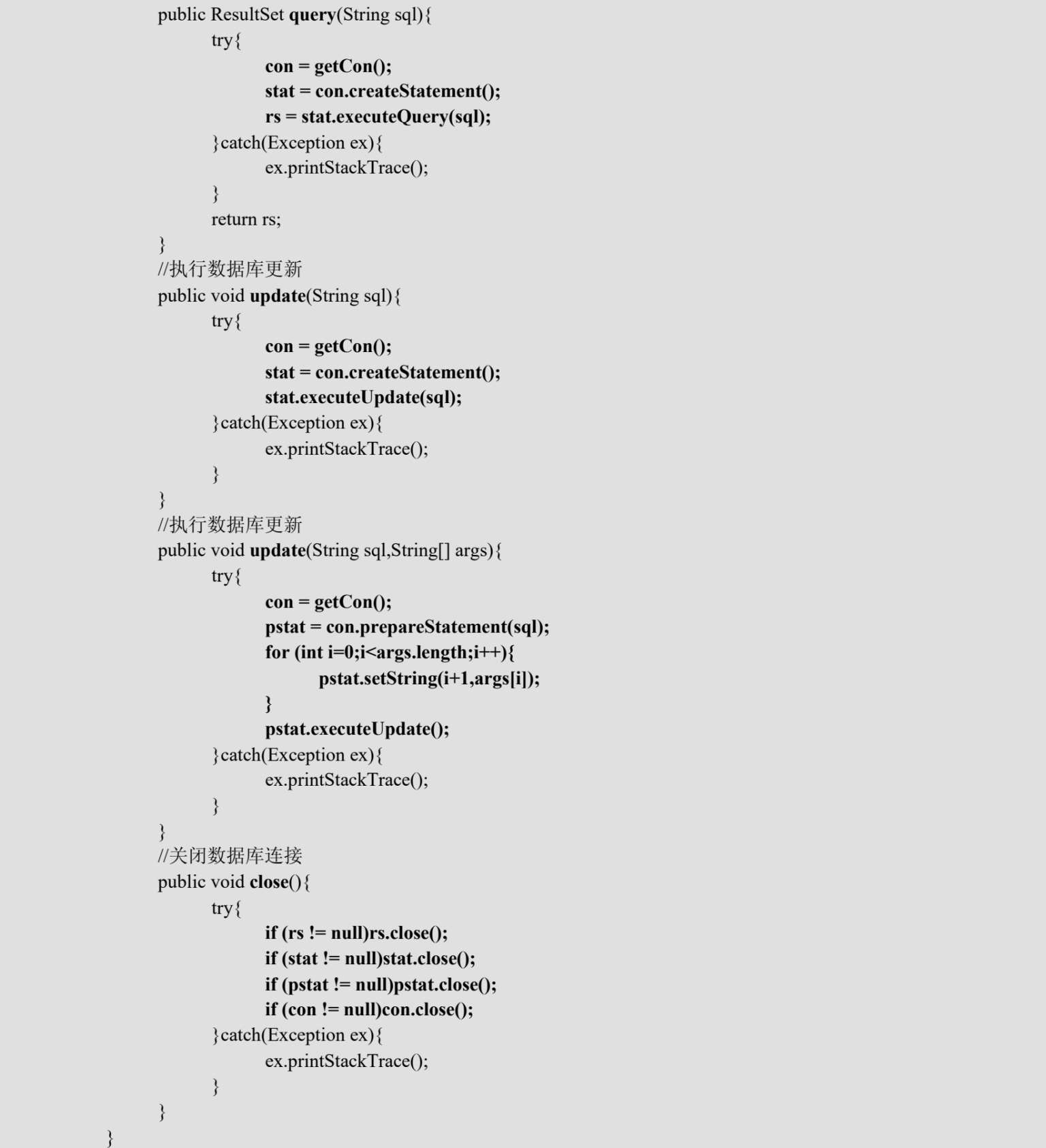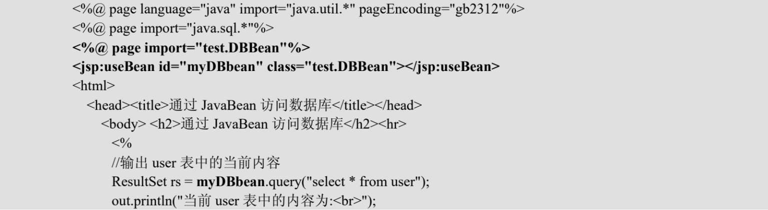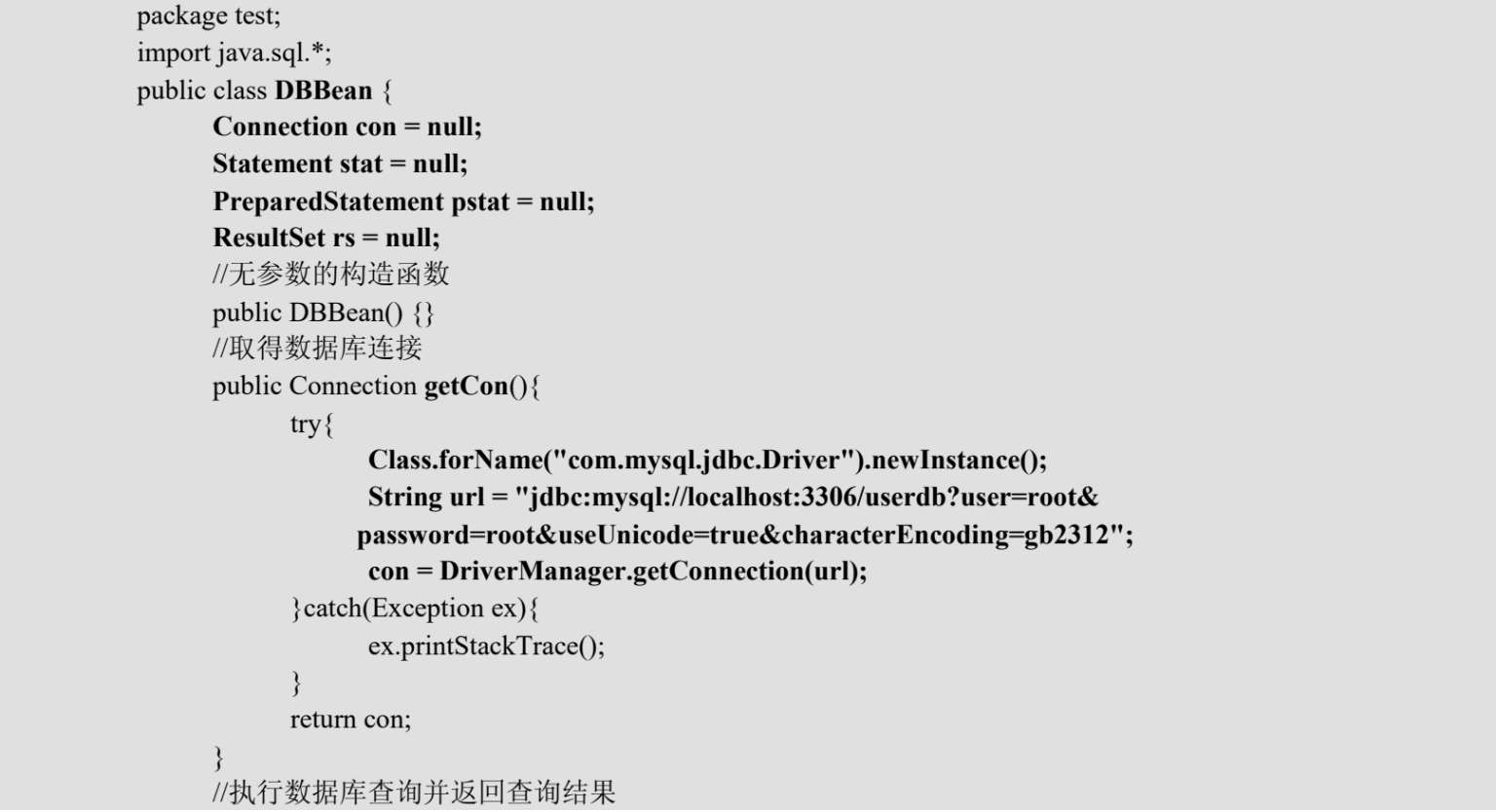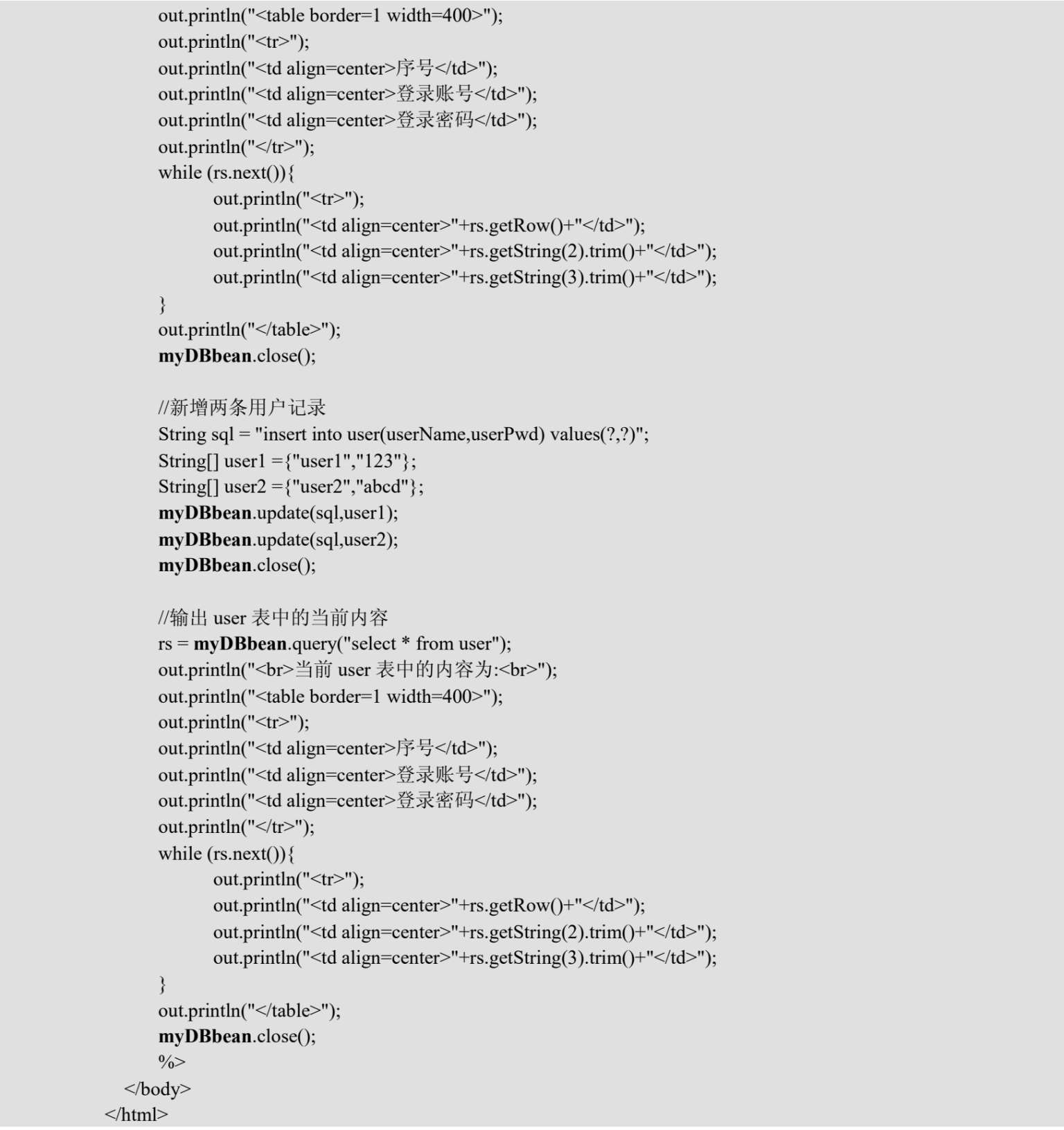 然后,再定义一个名为DBBean(见例程4-6)的JavaBean用来封装数据库的操作。