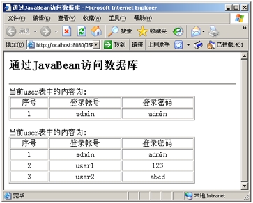 最后,便可以在JSP文件index.jsp(见例程4-7)中调用DBBean来完成数据库的操作。
