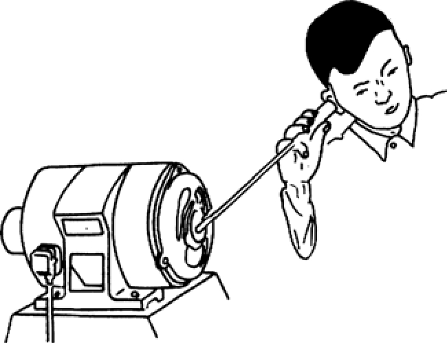 听就是凭耳朵听电动机在工作时有无异常声音。电动机正常运转时,滚动轴承仅有均匀连续的轻微“嗡嗡”声,滑动轴承的声音更小,不应有杂声。滚动轴承缺油时,会发出异常的声音,则可能是轴承钢圈破裂或滚珠有疤痕,轴承内混有沙、土等杂物,或轴承零件有轻度的磨损。严重的杂声可以通过耳朵听出来,轻微的声音可以将一把大螺丝刀抵在轴承外盖上,耳朵贴近螺丝刀木柄来细听,如图2-41所示。