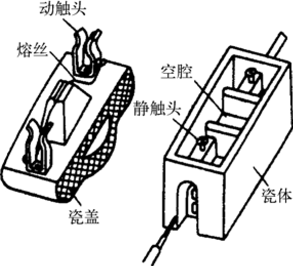 熔断器是低压线路及电动机控制电路中主要起短路保护作用的器件。它串联在线路中,当线路或电气设备发生短路或过载时,通过熔断器的电流超过规定值一定时间后,以其自身产生的热量使熔体熔化而自动分断电路,使线路或电气设备脱离电源,起到保护作用。图3-5所示是一种较为常见的RC1A系列瓷插式熔断器的外形结构图。