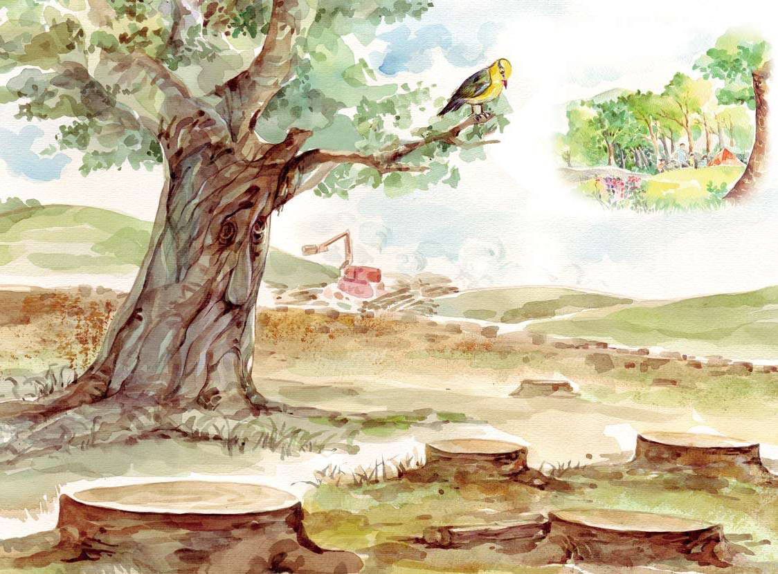 树爷爷望着远方,伤心地说:“从前啊,这里是一片大森林,树木和人类朝夕相处,快乐地生活在一起。”