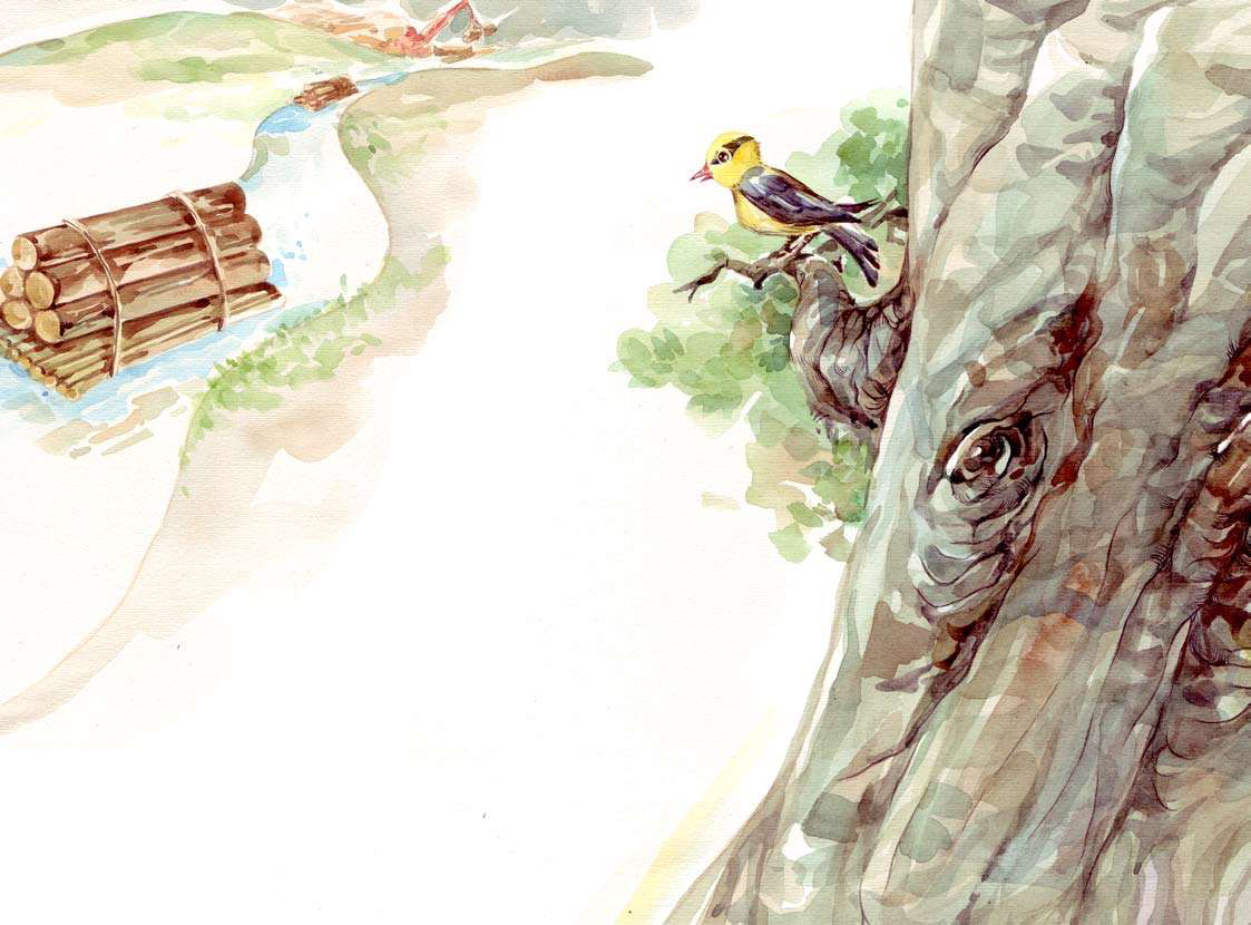 一只黄鹂停在树爷爷的肩膀上,用清脆的声音问:“树爷爷,您为什么伤心呀?”