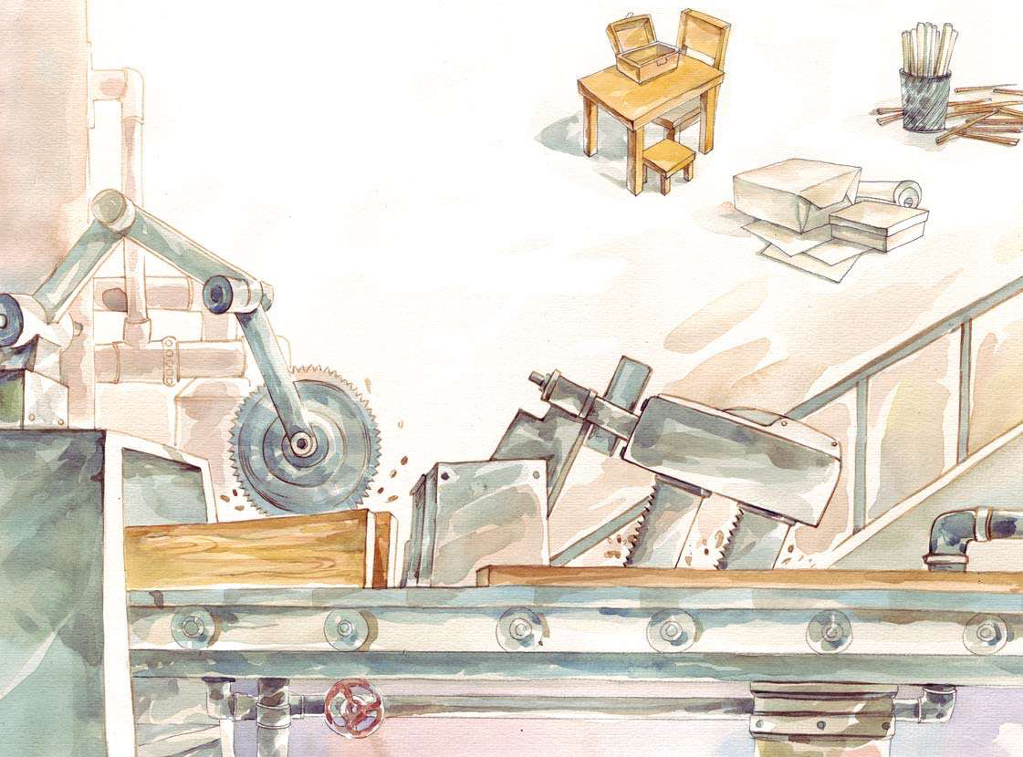 “人类种植树木,砍伐已经长大的树木。砍伐下来的树木在工厂里被切割、加工,有的成了建筑材料,有的被做成各式各样的家具,有的被加工成了纸……”