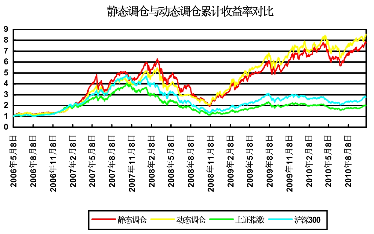 从图2-32中可以看出,动态调仓和静态调仓策略相比,在2006年、2008年、2009年、2010年收益率都有一定的提高,但是提高的幅度不是很大,并且动态调仓涉及的条件和参数较多,需要深入测试与研究。