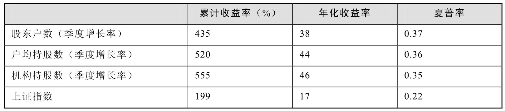 (3)在步骤(2)的基础上,分别根据股东户数(季度增长率)、户均持股数(季度增长率)、流通股中机构持股数(季度增长率)、单个指标及其分层组合和打分组合进行选择。