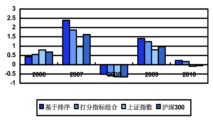 图2-31 筹码选股中分层排序和指标组合打分方法在不同年份的收益率对比