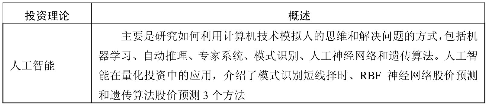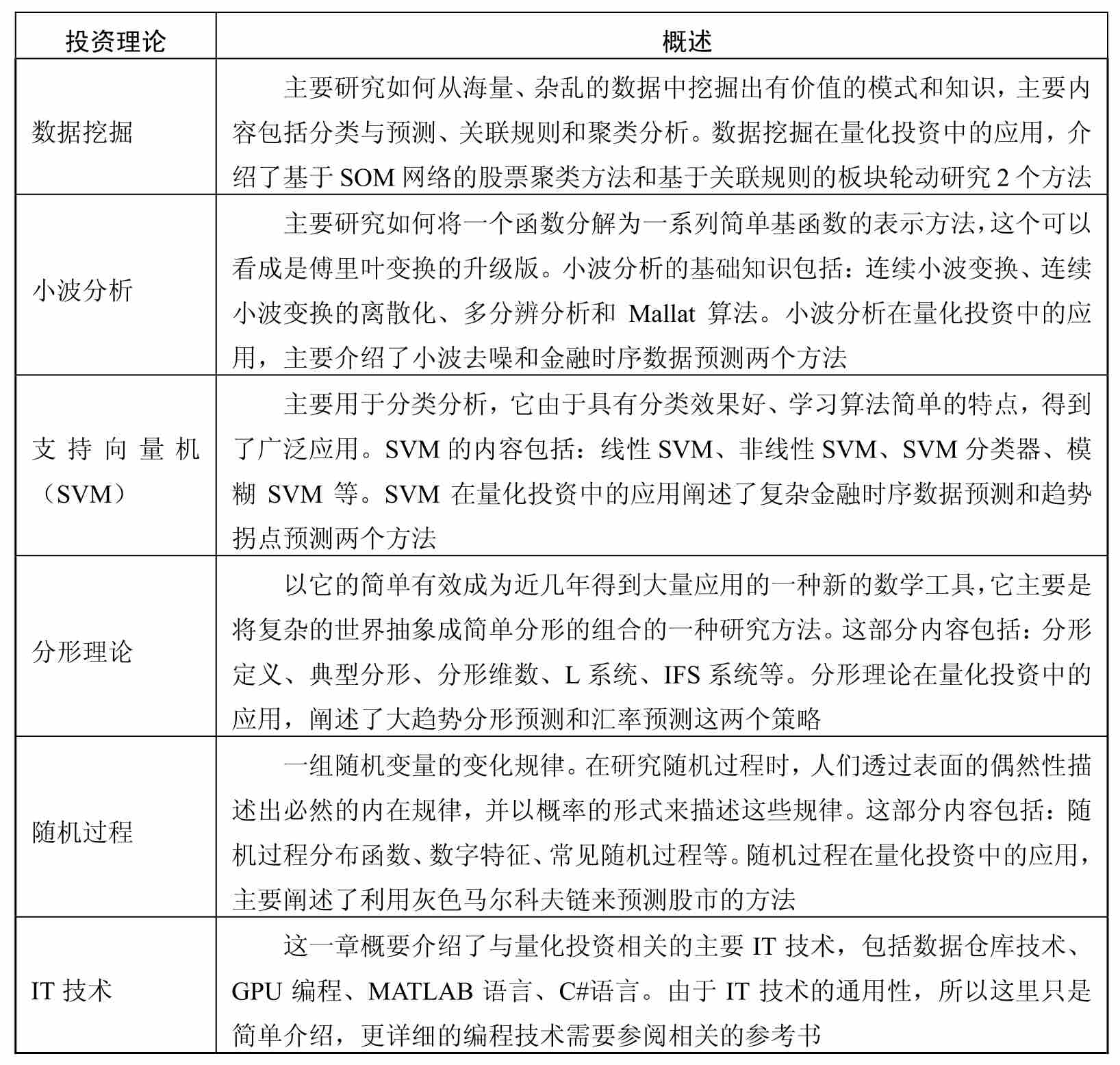 理论篇主要阐述了支持量化投资的各种数学和计算机工具,这部分的内容对读者的数学功底有比较高的要求,一共有7章,分别是人工智能、数据挖掘、小波分析、支持向量机、分形理论、随机过程和IT技术。