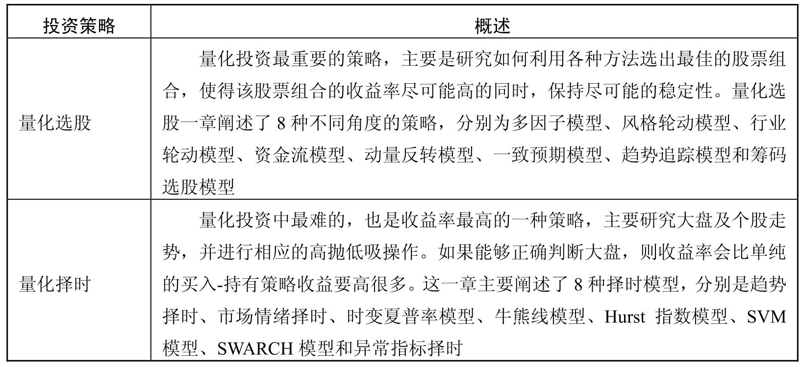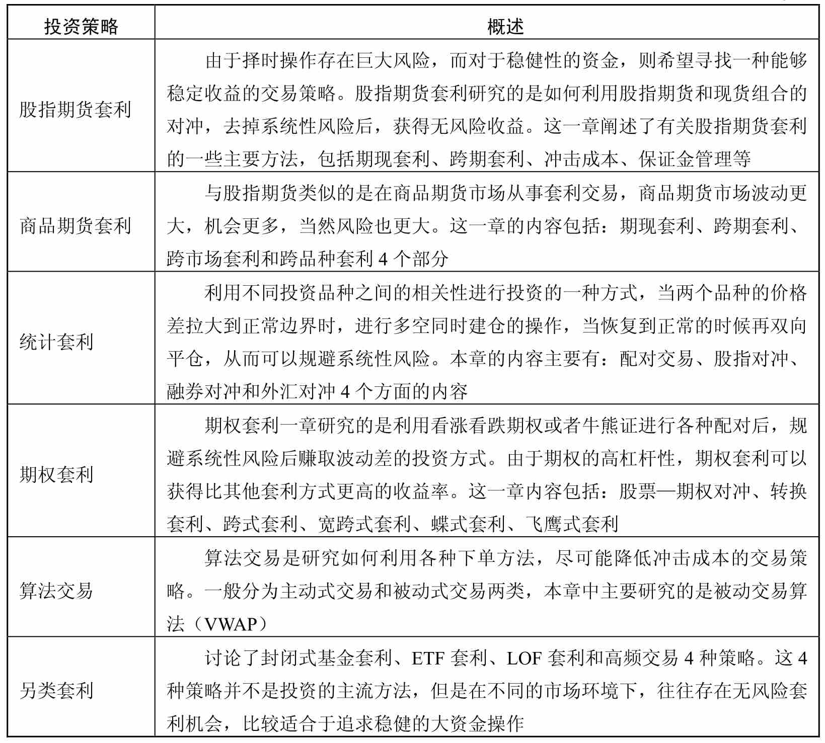 策略篇一共介绍了8个方面的投资策略,分别是量化选股、量化择时、股指期货套利、商品期货套利、统计套利、期权套利、算法交易及其他策略。