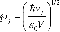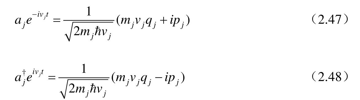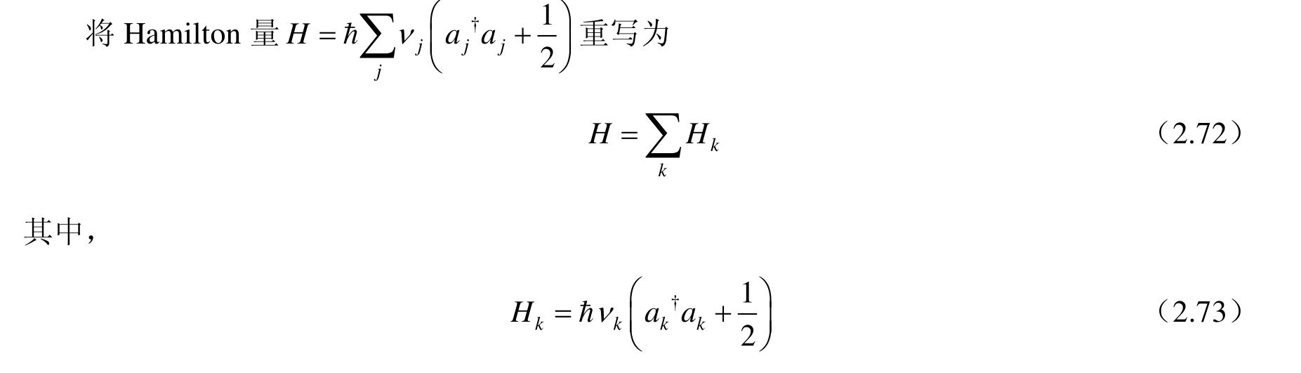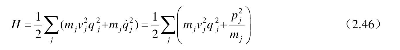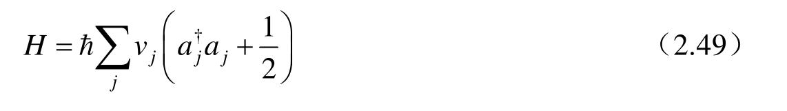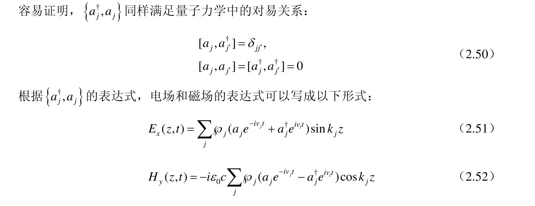 其中,v j =jπc/L是腔模的本征频率;V=LA是谐振腔的体积;m j 是质量的量纲,引入它仅仅是为了在单模电磁场和简谐振子之间建立类比。此时电磁场方程的形式可类比于质量为m j ,运动位置为q j 的谐振子运动方程。