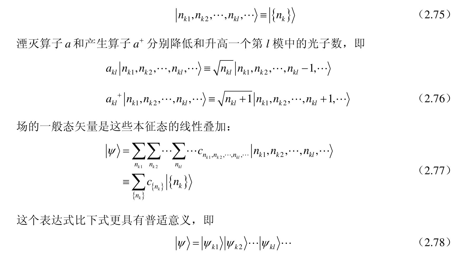 是态矢量的一般模型。式(2.77)包含了式(2.78)态矢量的类型,式(2.78)描述的是各个模之间相互独立时的情况,而更一般的情况是不同场模之间存在相互关系,这导致了一个普适系统中各种场模之间的相互作用。比如连续变量中的孪生光束,就不能写成式(2.78)的形式,而只能由式(2.77)来描述。