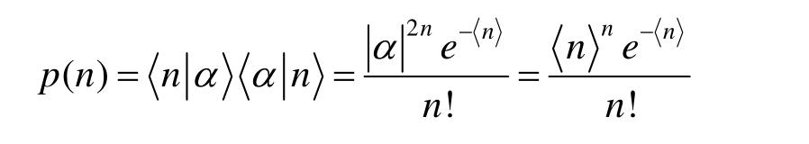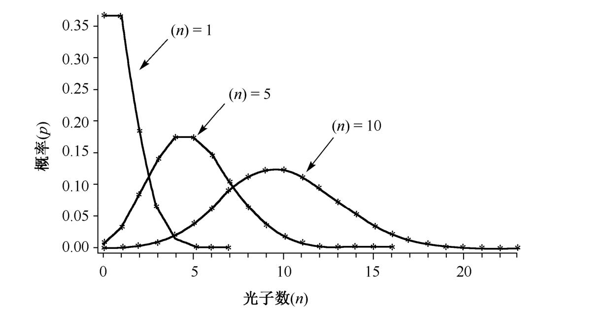 ,它无法分离,只要被窃听了,合法的接收方就无法再探测到,编码在光子上的信息就可以丢掉了。但遗憾的是,在现实中很难制备这样一个纯的Fock态,通常都是采用一个弱相干态来代替,让其平均光子数低于1,近似认为是单光子。这是因为相干态可以用Fock态来展开,它服从泊松分布,可以准确地确定其中单光子态的概率,这将在2.3.3节详细介绍。