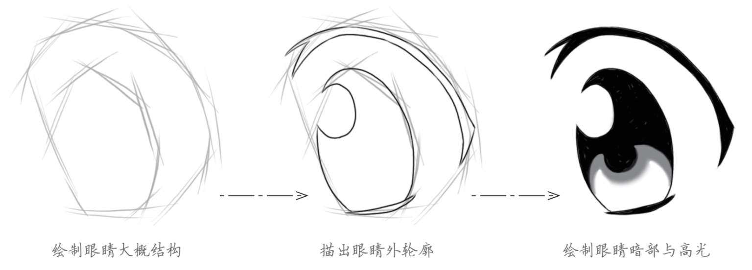 绘制美少女的眼睛要把握外形大而圆的特点,同时有夸张的高光表现,而两只眼睛要保持对称的效果。