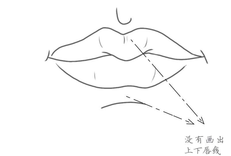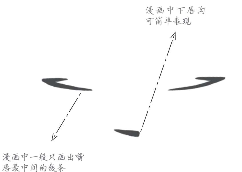 与现实中的嘴唇不同,漫画中少女的嘴唇一般都非常简化,将人中、上下唇线省略掉,只留下最能表现嘴部运动的中间线即可。