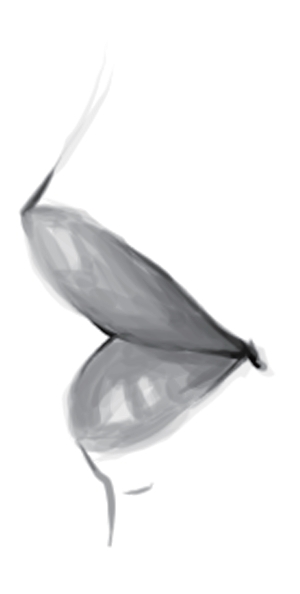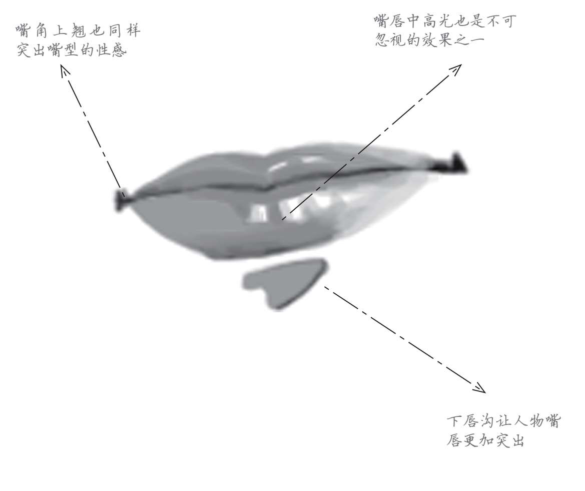 TIPS: 性感是因为口红将嘴唇勾勒出了一个状态,所以在绘制性感嘴唇的时候,会绘制得带有半真实的感觉在里面,利用阴影关系,制造出上下唇。