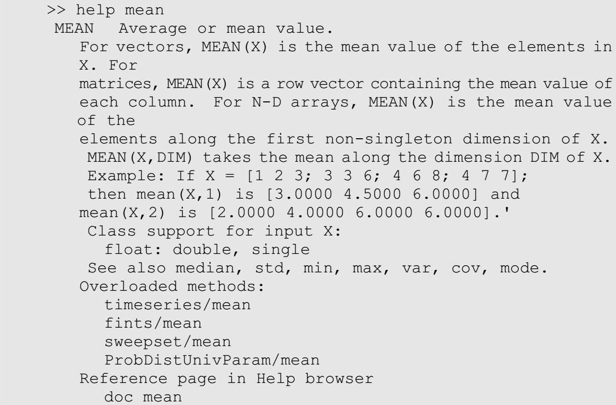 mean是求平均值的函数。doc functionName命令将打开联机帮助系统,一般与help functionName得到的内容是一致的,但前者可能更详细。值得一提的是,在帮助信息的末尾还提供了其他重载函数的链接,用户可以直接单击进入查看。用户应注意所要查询的是函数多个重载形式中的哪一个,避免误用。