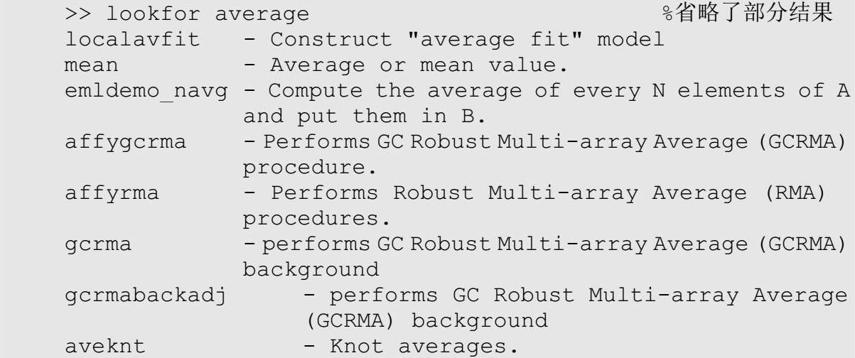 如果用户不知道函数的完整或部分名称,只知道与之相关的一些关键字,也可以进行查询,方法是使用lookfor函数。在命令窗口中输入“lookfor keyword”,keyword即用户所指定的关键字。例如,查找求平均值的函数,用户首先想到关键字average,因此输入lookfor average,即可找到求平均值的函数mean。
